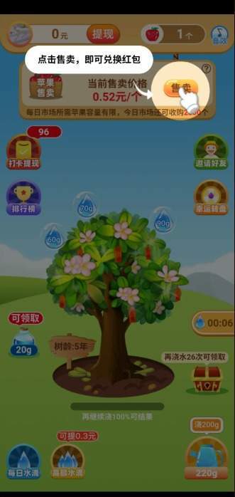 吉祥果园红包版玩法非常简单,就是每天为自己的果树苗浇水施肥,让它快速长大就能获得收益。每天只需要一点点时间就可以完成任务,非常的轻松,没有任何的操作困难,在这个过程中玩家还能收获不少的快乐,还有一些趣味小游戏,能加速果树的生长哦。