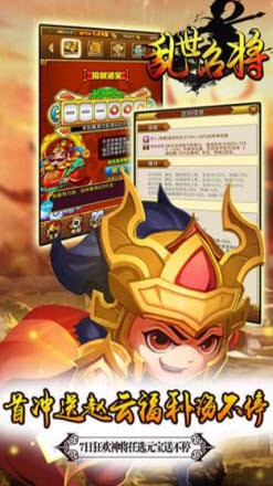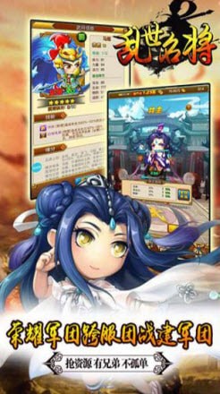 乱世名将是一款全新的大型策略性三国冒险系列。运用了经典的画风,把三个著名的英雄都Q版了,但是每一个英雄都应该有自己的特点,描绘的淋漓尽致。在游戏中需要玩家连续收集大量英雄卡牌,以增加自身的专有属性,稀有卡牌更能显著提升。