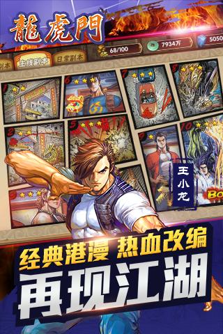 龙虎门是一款根据同名流行漫画改编的卡牌手游。原本精彩的故事在游戏中完美再现。游戏好处多多,好玩,人物造型和招式完全还原;原技能学习系统允许主角向王小虎、王风雷等知名人物学习技能;战斗打击很强,连击操作很好用。有了漂亮的组合技巧,可以充分体验战斗的乐趣;丰富的训练线路和装备体系,让你自由打造心中最强的龙虎门梦之队。