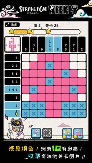 这款游戏就是通过一只猫咪的视角,挑战您的逻辑能力,并尝试找每一个素艺术插图。密切关注网格上的数字线索,您将拥有所需的所有信息,以获得比侦探更快的解决方法!怪异猫解密官方下载游戏玩法有趣,新手玩家也可以很快上手,简洁的界面一目了然。丰富的游戏内容,操作非常的简单,有喜欢的朋友快来下载体验吧。