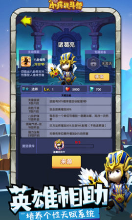 小兵战斗营最新版作为一款三国动漫风格的策略战斗冒险游戏,各种经典的三国角色都可以解锁获得,他们外观看起来很Q萌,都搭配着全新的武器和铠甲,你将带领他们在不同的军事战场中自由冒险战斗,士兵们要合理的派兵布阵,通过兵种克制巧妙战胜强敌。