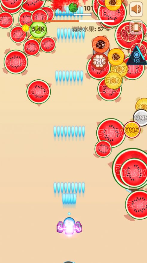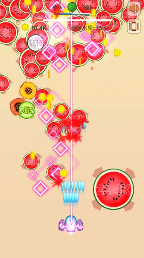 3、游戏的风格偏清新解压,水果不断碰撞然后变大,这真的很魔性,真的是常人很难想象到的题材。