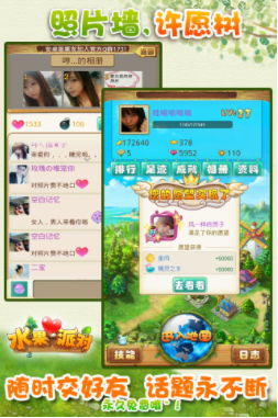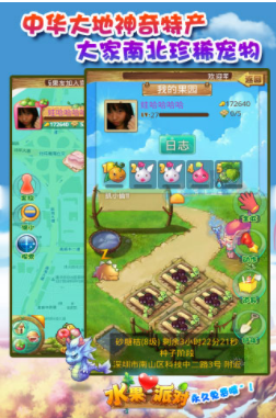 水果派对作为一款模拟操作的社交手游,集农场操作和互动好友于一体。偷菜,我的王国,真实的地理地图,LBS线上线下定位,交友,庄园,战争体系重新浮现,更加精彩全面,身边无时无刻都有无限挑战!适合任何年龄,豪华的个人庄园系统,美女如云的照片墙分享,许愿树的互动,这游戏界面非常漂亮精致,整体上费了不少功夫,给游戏增添了不少场景。它会根据你的年龄进行定位,把同龄的人聚集在一起,玩一个有趣的偷菜游戏,让你在玩游戏的过程中交到其他同龄的朋友。