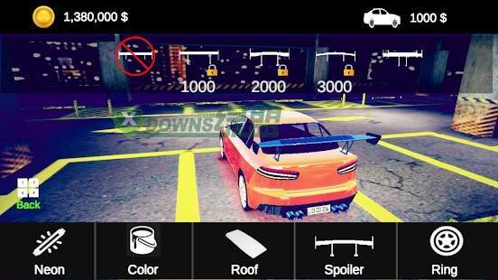 - 车库:定制汽车车轮,颜色,扰流板,车窗颜色,车牌,贴纸,排气,外倾,引擎盖,覆盖,霓虹灯,号角声音或悬架。