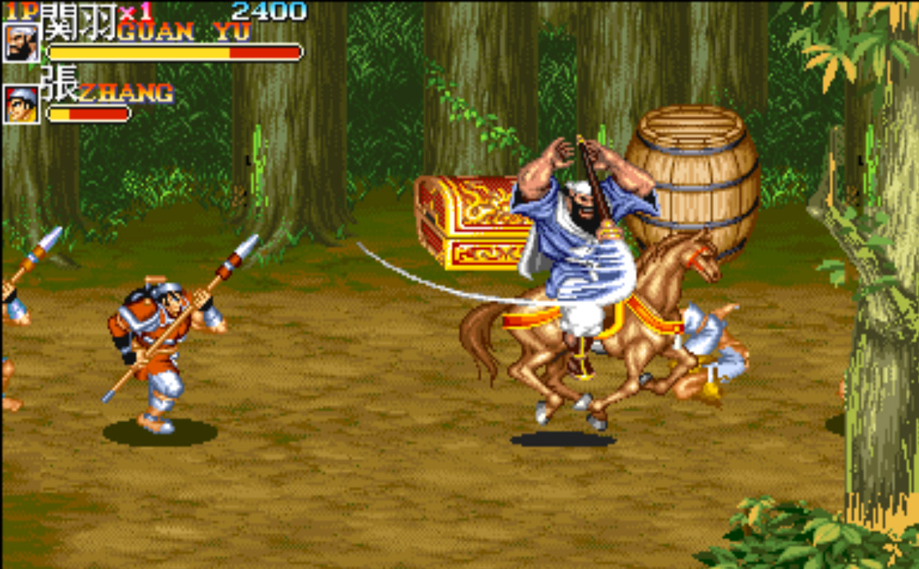 3.赵云:步行时执剑,动作最敏捷,为唯一没有地面摔技的角色,但能空摔,绝技为升龙斩。骑马时执长枪。