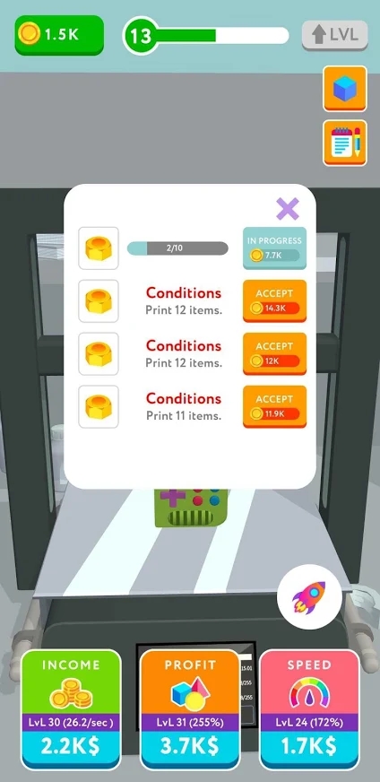 3D打印机模拟器游戏随着科学技术的进步,印刷技术已不再局限于平面纸,今天,我们要做一些三维的事情,这些是我们在生活中经常看到的事情,设置好机器,确定好型号后,就可以开始操作,仔细观察货物的生产过程,同时,你可以花钱来提高你花钱的速度和效率。
