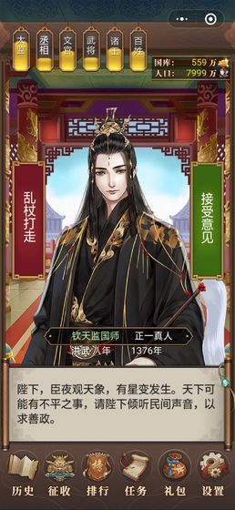 大明发配三年朱允文求我救命游戏作为一个策略类手机游戏,在这里玩家们能够来尝试经营管理大明帝国,让你在这里来打造你自己掌控之下的大明王朝。每日处理各种国家大事,治理你的朝政,让你在这里来完成你自己的王朝盛世。