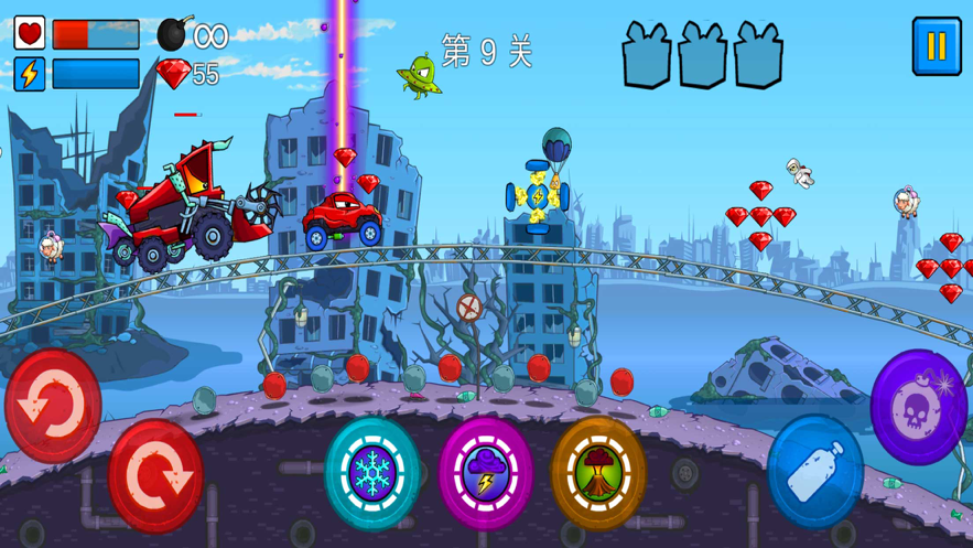 3、夺取超级炮、加速道具等装备,抢先一步摧毁敌人,你有本事在这款飙车游戏中脱险求生吗?