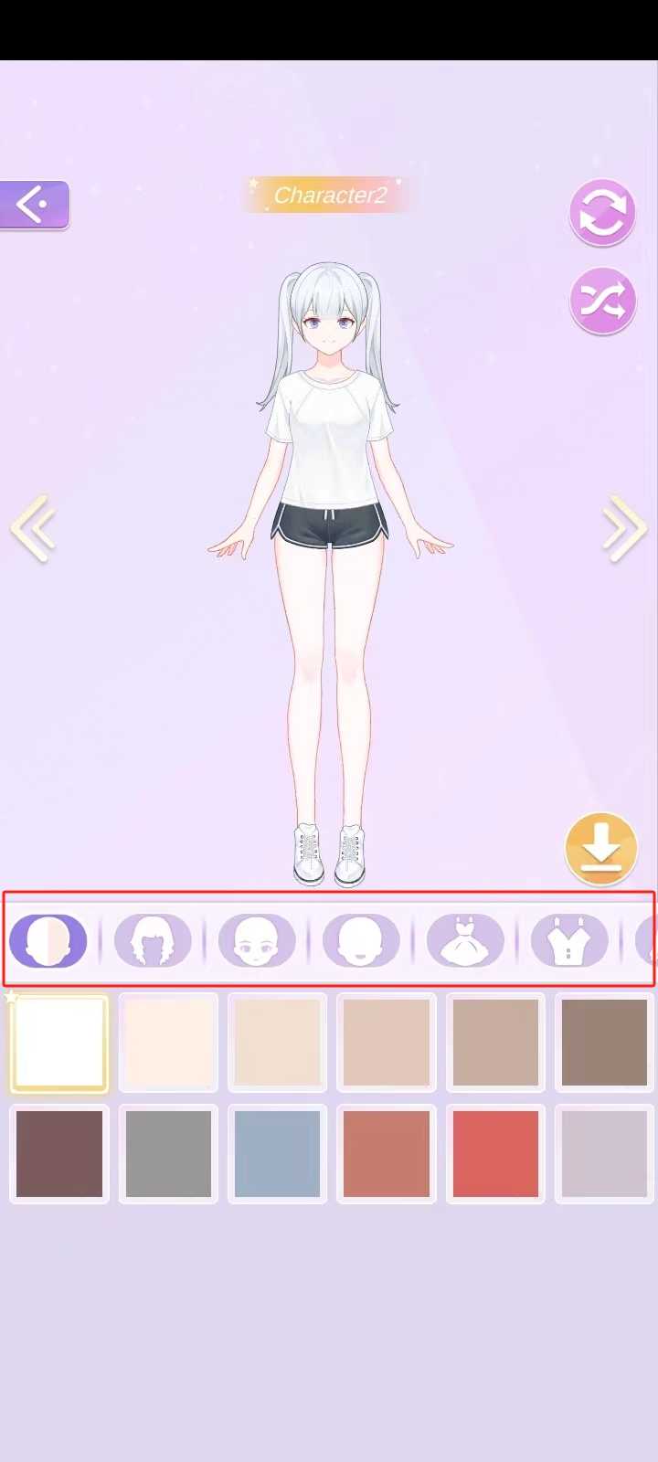 2、当玩家进入装扮页面后,便能够对角色的肤色、发型、眼睛、嘴巴、服装、鞋子以及发饰等诸多方面展开调整。此处可供选择的种类十分丰富,玩家完全能够依据自己的喜好来进行搭配。值得一提的是,本版本没有广告,玩家无需观看广告就能获取物品。