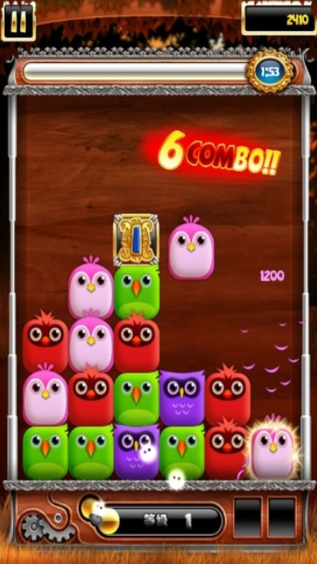 六只同颜色的小鸟,奖励闪电鸟,当闪电鸟消失时,可使其同类的小鸟或冰消失;