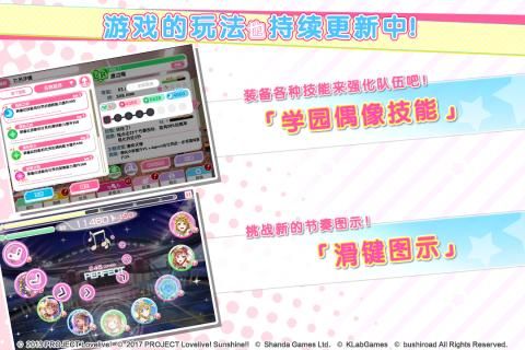 以μ's的9位社员为首,各类社员都将会登场挑选心仪的社员,组成您自己的队伍吧!设员收集和养成收集到的社员通过练习使其成长,成长越高在 LIVE 模式中获得的分数就越高,全程语音的主线剧情,主线剧情将由 μ's 的9位社员一起出演,原创剧情将全程语音哟!每个社员的支线剧情,绊的加深将解开各成员专有的支线剧情μ's 的社员专属剧情当然也是全程语音!