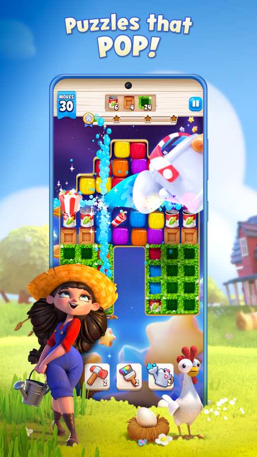 卡通农场pop是一个由Supercell推出的模拟经营游戏.可爱的动漫画面风格,各种丰富极具趣味的方式展示,拼图消除玩法,这里有可爱的动物们还有令人放松的游戏气氛,让你打造梦中农场.