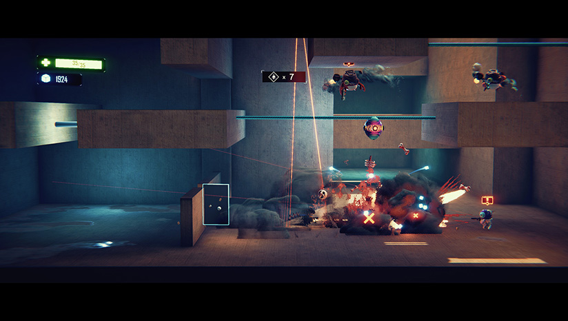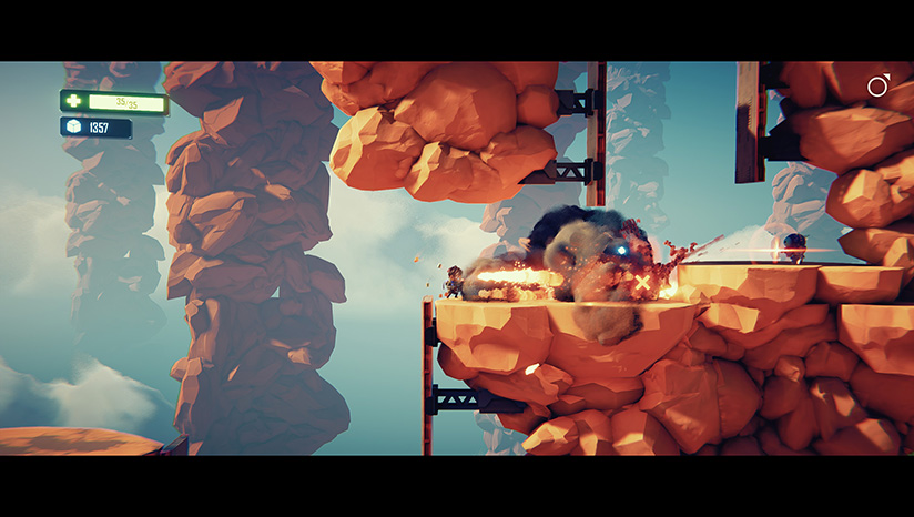2、游戏结合了横版射击与跑酷的玩法,并在此基础上融入了蹬墙跳、空中冲刺在内的动作元素。