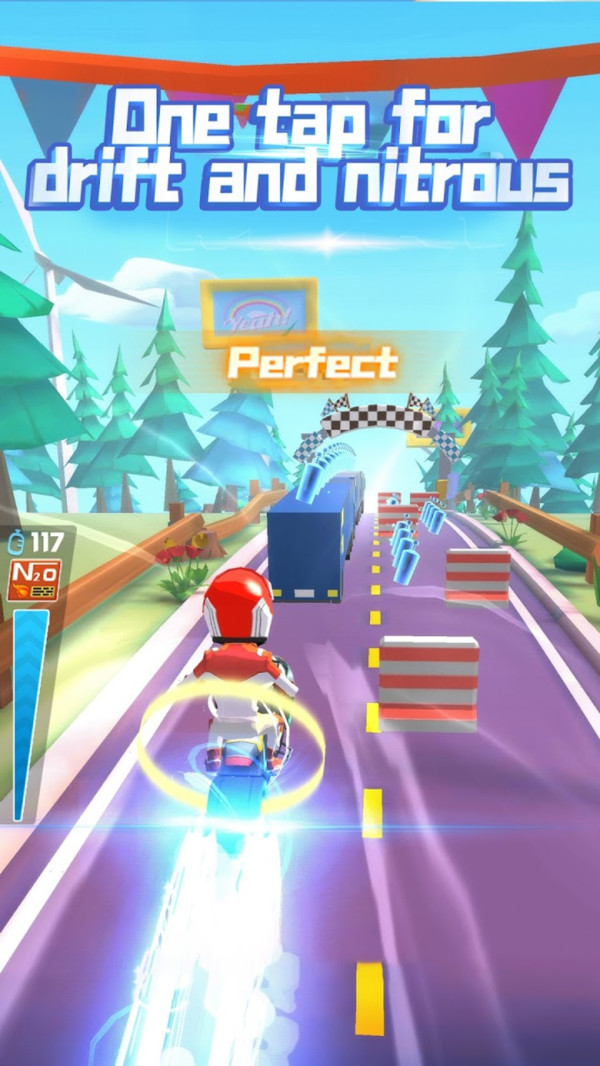 3、在高速飞驰中快速反应躲避所有障碍物,用最好的方式来穿过弯道,甩开所有对手。
