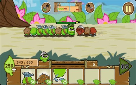 1.玩家朋友们在对战关卡中要尽量多的收集绿色能量叶子,可以为毛毛虫配置更多武器。