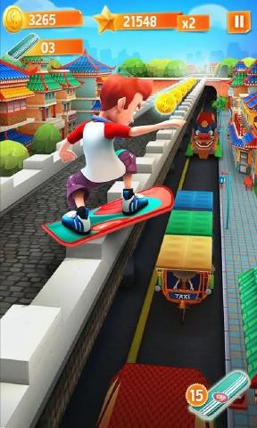 2、跑酷过程中有着各种不同的道具可以收集使用,可以使用到道具为自己的角色增加buff。