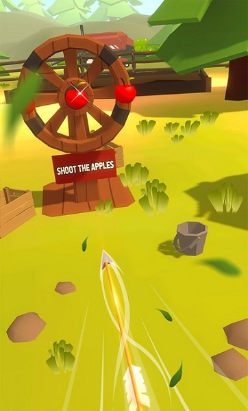 3、玩家需要根据距离来估算需要抬起多高才能正好命中远端的苹果,通过射击苹果来解锁不同的弩。