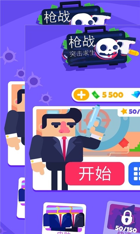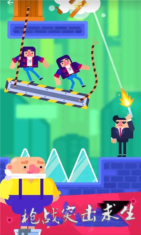 3、枪战突击求生游戏作为一款卡通风格的益智闯关手游。游戏画面是像素风格,场景简约,色彩渲染丰富。玩家在游戏中是一个杀手,需要用自己手中的武器击败站在各个地方的目标人物,大部分时候,需要用到折射原理,玩家要计算好角度,因为子弹是有限的,子弹用完了,目标人物还没被击杀的话,游戏就结束了