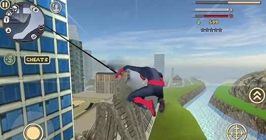 5、游戏操作非常简单,游戏中玩家只需要点击左右移动按钮就可以控制蜘蛛侠移动的方向,玩家也可以切换为摇杆,点击蜘蛛网图标就可以发射蜘蛛网在城市中穿梭,点击射击按钮就可以用武器射击敌人