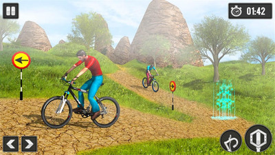 2、自行车下坡作为一款好玩有趣的休闲模拟自行车竞速类型的游戏,游戏的画面十分真实,采用了第一人称的操作方式,给人一种身临其境的感觉,游戏中玩家要骑行着自己的自行车和其他的选手一起参加越野比赛,各种各样的赛道呈现在眼前,颠簸的山路,十分考验玩家的操控能力,不断的磨炼自己的技术,向着优胜前进