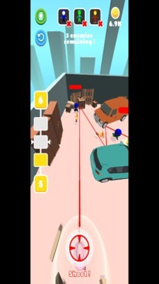 1、看我拿三杀作为一款充满了趣味的休闲益智射击闯关类型的游戏,游戏中你要操控自己的角色完成三杀,这个三杀不是普通的三杀,是要用一发子弹干掉任务要求的三个人,十分考验玩家的计算能力,子弹射击出去后在有些物体上回进行反弹,有些物体上回穿透过去,需要玩家经过缜密的思考
