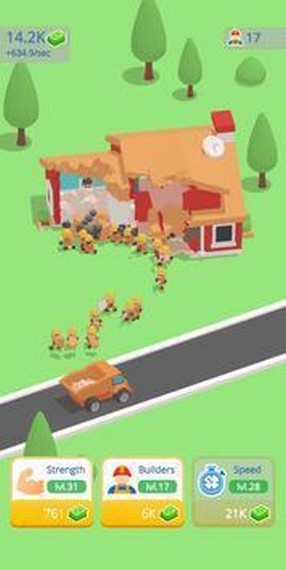 2、空闲拆除作为一款好玩有趣的建造拆除模拟经营类型的游戏,游戏的画面十分的卡通清新,游戏中玩家经营着一家拆迁公司,从小的房屋开始进行拆迁,完成拆迁任务获得资金,拆迁的速度越快,获得的资金就越多,资金可以用来升级拆迁工人的速度和力量,提升他们的拆迁能力,摧毁更多更大的建造