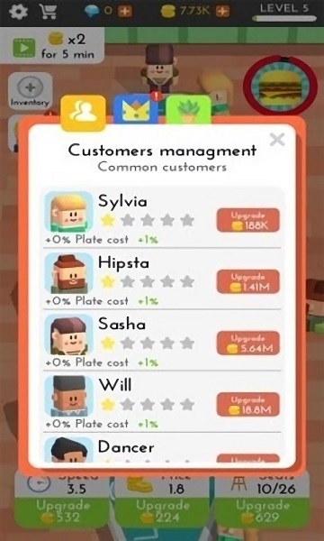 4、您想拥有最好的咖啡馆和最大的餐厅帝国吗?打开新角色并升级它们。厨师们为每种口味烹制美食!他们帮助您养活所有客人!尝试发展您的业务并致富。谁是世界上最好的餐馆大亨?是你!