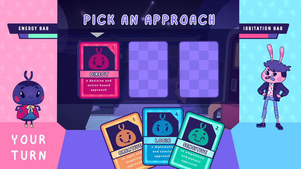 每次回合都有3个阶段。方法,行动和奖金。他们都有自己的特别卡,你可以选择。在最后一段阶段之后,卡将生效,这是你对手的转折!但是,并非每个组合都会有效,具体取决于您正在处理的错误。