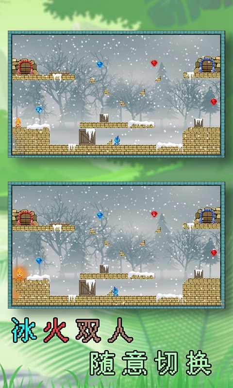2、冰与火的冒险2是一款休闲闯关游戏,冰与火的冒险2手游收集宝石,解决难题,并完成各种机关挑战,冰与火的冒险2游戏中通关需要合理的冰与火两个角色的合作,不要忘了收集所有宝石。如果您收集了所有宝石,你会得到3颗星