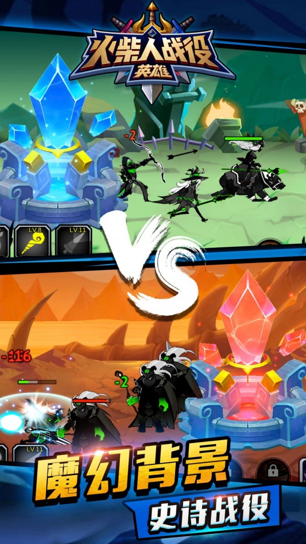 2、火柴人战役英雄是一款超级有趣的动作冒险手游,游戏采用经典的火柴人作主角,精致细腻的卡通画风搭配丰富鲜艳的色彩带玩家进入到热血奇幻世界里,玩家在游戏里可以操控着火柴人使用各种武器装备来击败敌人保卫自己的家园
