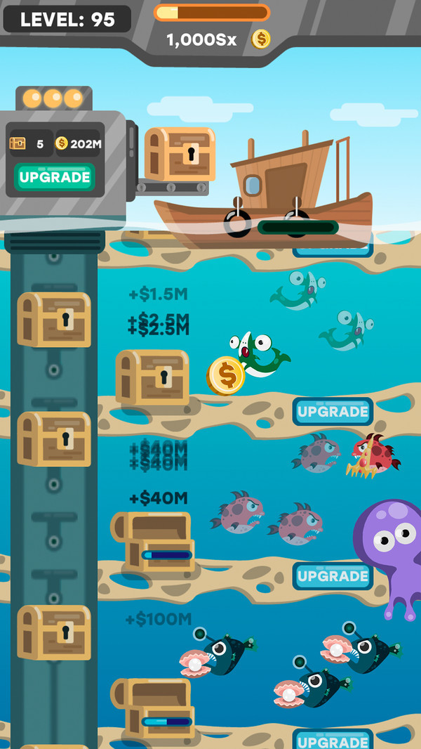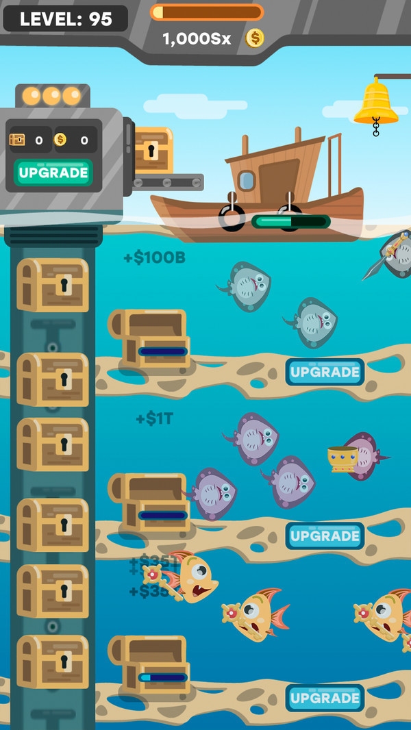 2、首富渔夫是一款卡通风格的模拟经营类游戏。玩家将在游戏中管理自己的渔业生意。在不同深度的海域中投放不同的鱼苗,你的收益是会源源不断的。并且海底还有各种珍奇的宝箱,打开之后也会有丰富的奖励。游戏的操作非常的轻松,各种鱼的形象也是非常的魔性。感兴趣的话就来试试吧