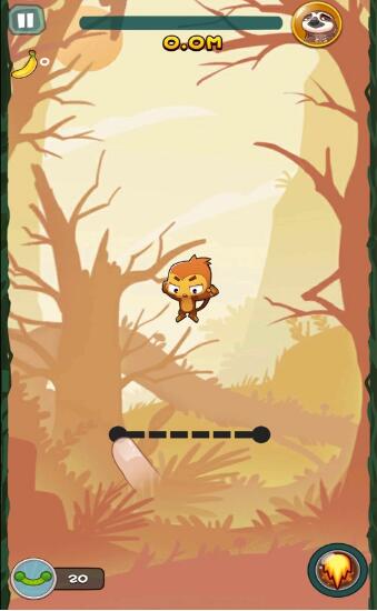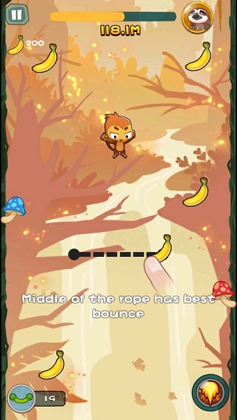 在游戏中利用绳子使猴子弹跳起来,在不断的下落,反复之中让其跳得更高,不断的升级弹力神等级,增加跳跃的次数以及高度,获得更高的分数。