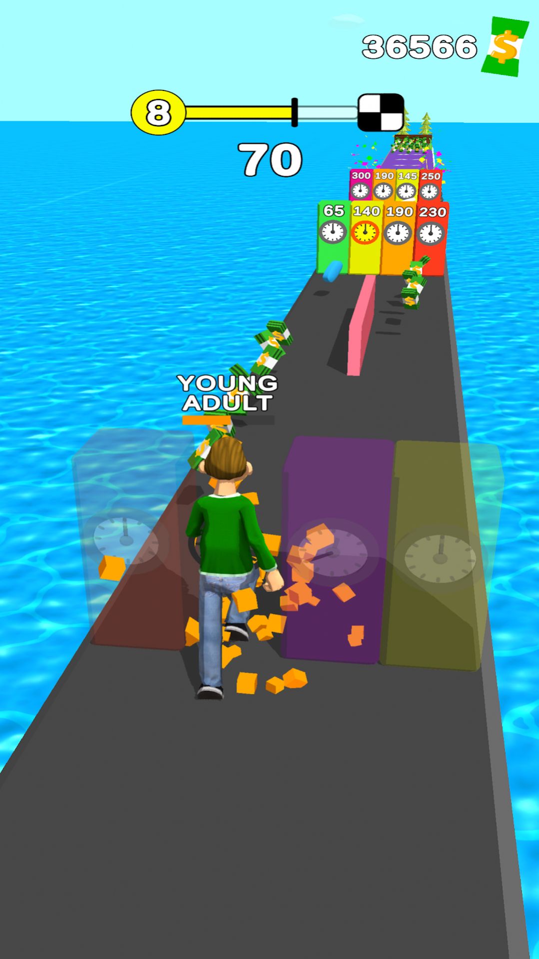 操控婴儿来进行闯关,在闯关过程中角色满满成长,小心的的躲避时间来防止自己变老,趣味玩法十分的耐玩,灵活的躲避各种障碍,还可以购买道具来帮助你,收集赛道上的钱来获得更高的分数。