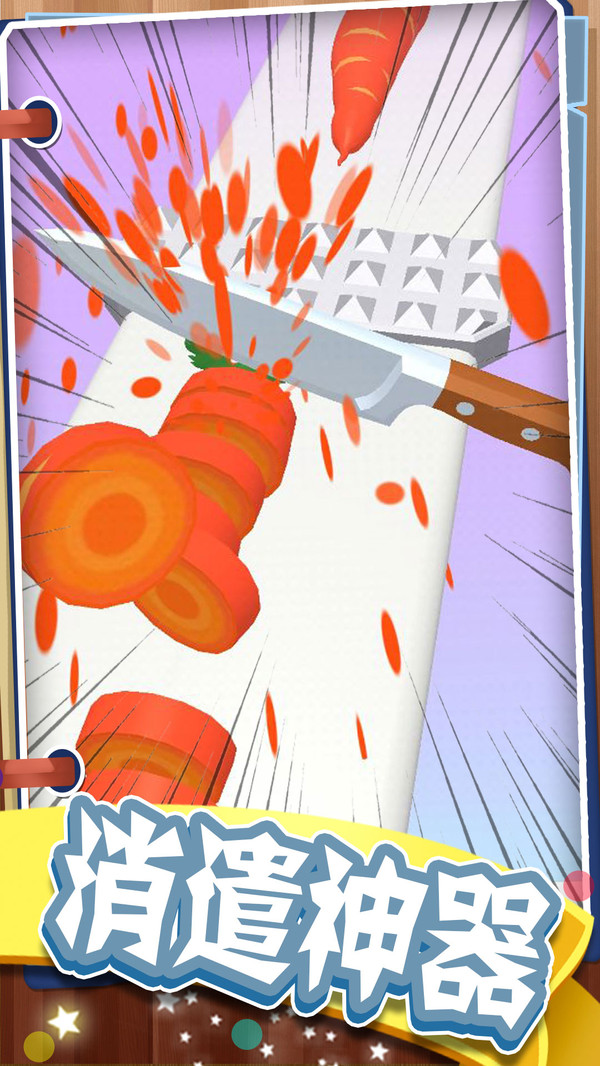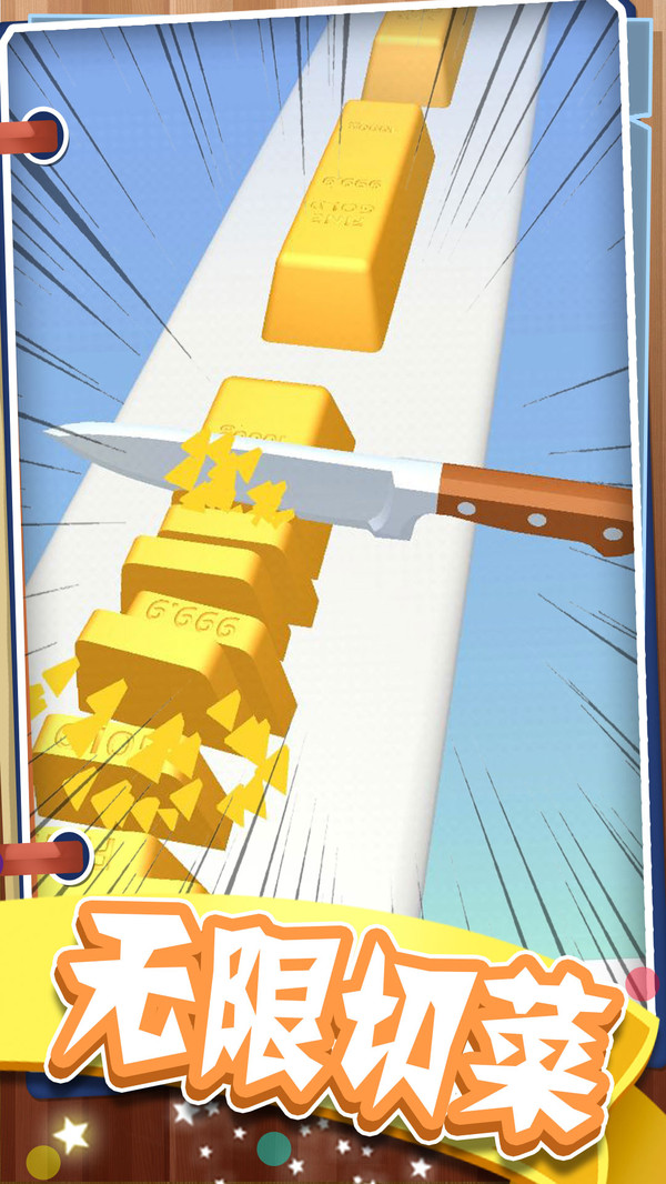 1、欢乐精彩有趣的闯关休闲游戏,操控菜刀疯狂切吧,一起来放松解压;