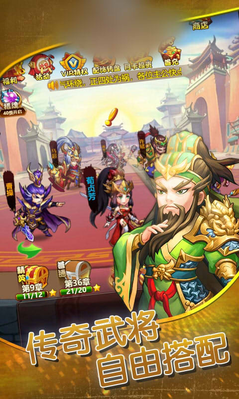 三国大世界手游公益最新版:精美的游戏画面和Q版的人物造型,打造出一个可爱而又震撼的三国世界,让所有人都可以大饱眼福。回合制的战斗模式非常爽,极具策略性的阵容搭配才是我们获得胜利的王者之道。基本上所有的武将都可以自由招募和养成,组建超强的阵容打败强大boss。