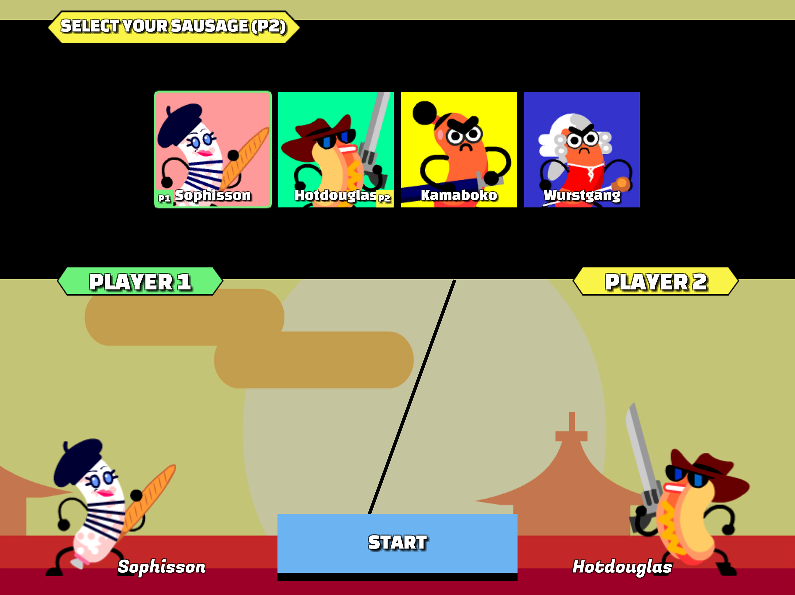 香肠武士游戏是一款非常有意思的动作格斗类游戏,在这款游戏中玩家将操控你的香肠人在赛场上进行格斗挑战,游戏中有着许多的不同的武器可以供玩家们挑选使用,玩家的目的只有一个,那就是战胜你的对手,不管你的对手有多强大,玩家总是可以寻找到敌人的破绽。