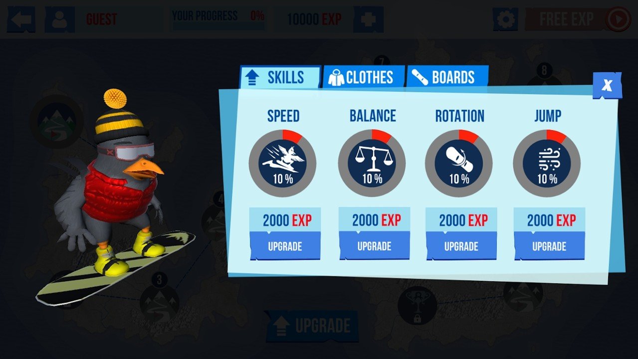 雪鸟滑雪板中玩家可以在此享受滑雪乐趣,你也可以在此解锁不同的滑雪板,可爱的雪鸟会一直陪伴你。