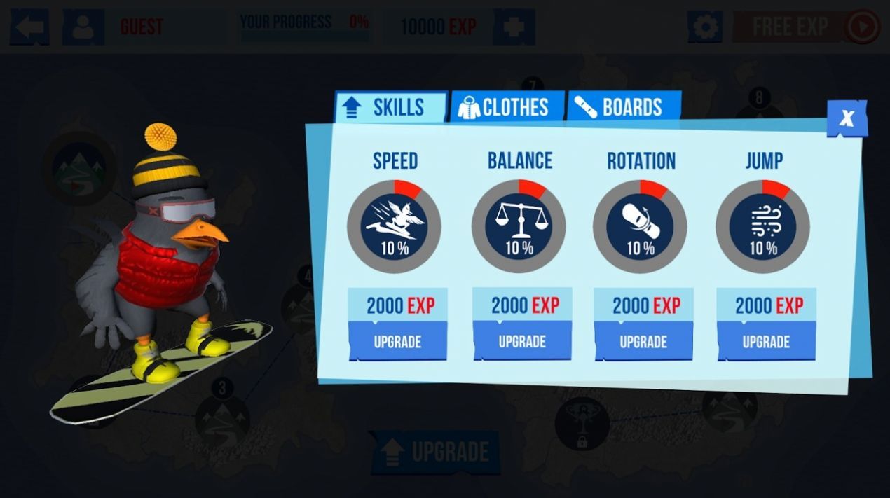 玩家能够去解锁多个不同的滑板来玩,好的滑板对你的滑雪也是很有帮助的。