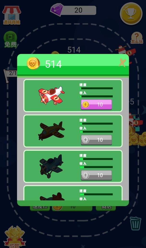 ·各种飞机,游戏中有20多种飞机,还有一些稀有的飞机正在等你收集