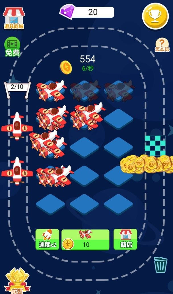 解锁更多的机位,然后购买合并更多的飞机,赚取大量的金币。