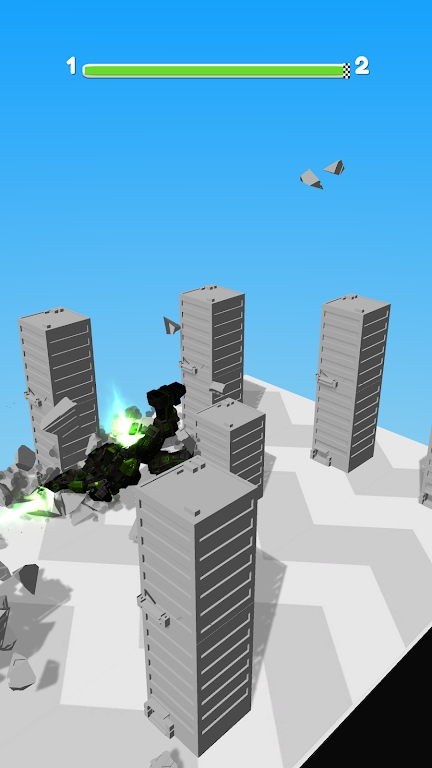 1、控制你的机甲进行闯关,在关卡中摧毁建筑物来进行挑战。