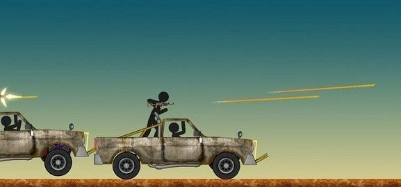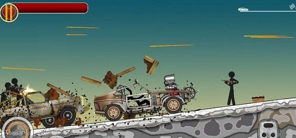 1、在途径的路上会遇到其他火柴人的射击,利用汽车装备的武器将它们击杀。