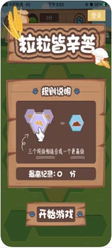 1、一款超好玩的合成游戏,将手机下方的稻谷、土堆等拖拽上方的大六边形;