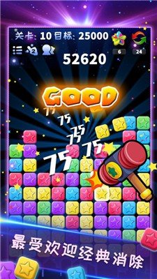 全新上线的点击消除类手游,消灭星星青春版游戏中玩家可以挑战各种不同的玩法模式,全新道具,全新玩法,每天上百万人狂点,画面可玩性完爆同类任何产品!我们做的是最懂你的游戏,做最好的游戏,快来一起挑战吧!