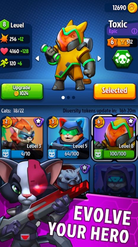 · 多个猫科动物角色已准备好加入战斗——赢得并收集积分以打开它们;