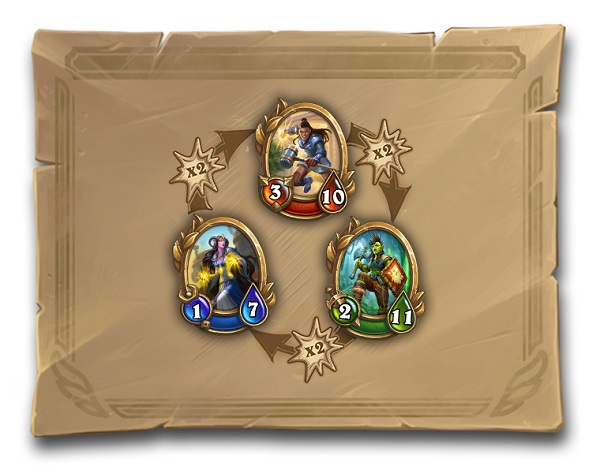 你可以使用任意佣兵组合来构建队伍,但如果忽视了某一身份,队伍就可能漏洞百出。在进攻时,斗士可以对施法者造成双倍伤害,施法者可以对护卫造成双倍伤害,护卫则能对斗士造成双倍伤害。在组建队伍的时候,你一定要谨记这种弱点。