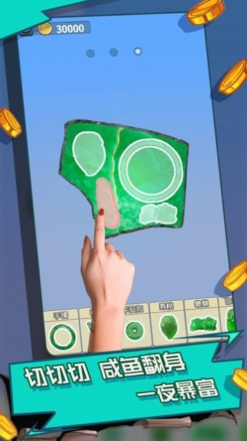 模拟真实赌石流程,手电照射、锯片开窗鉴定原石,考验策略和运气。