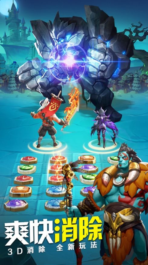 2、魔法之门,三消战斗,穿越魔法之门,用三消魔法击败大陆上邪恶怪物,可获得灵魂石和强化装备,用于培养和强化英雄;