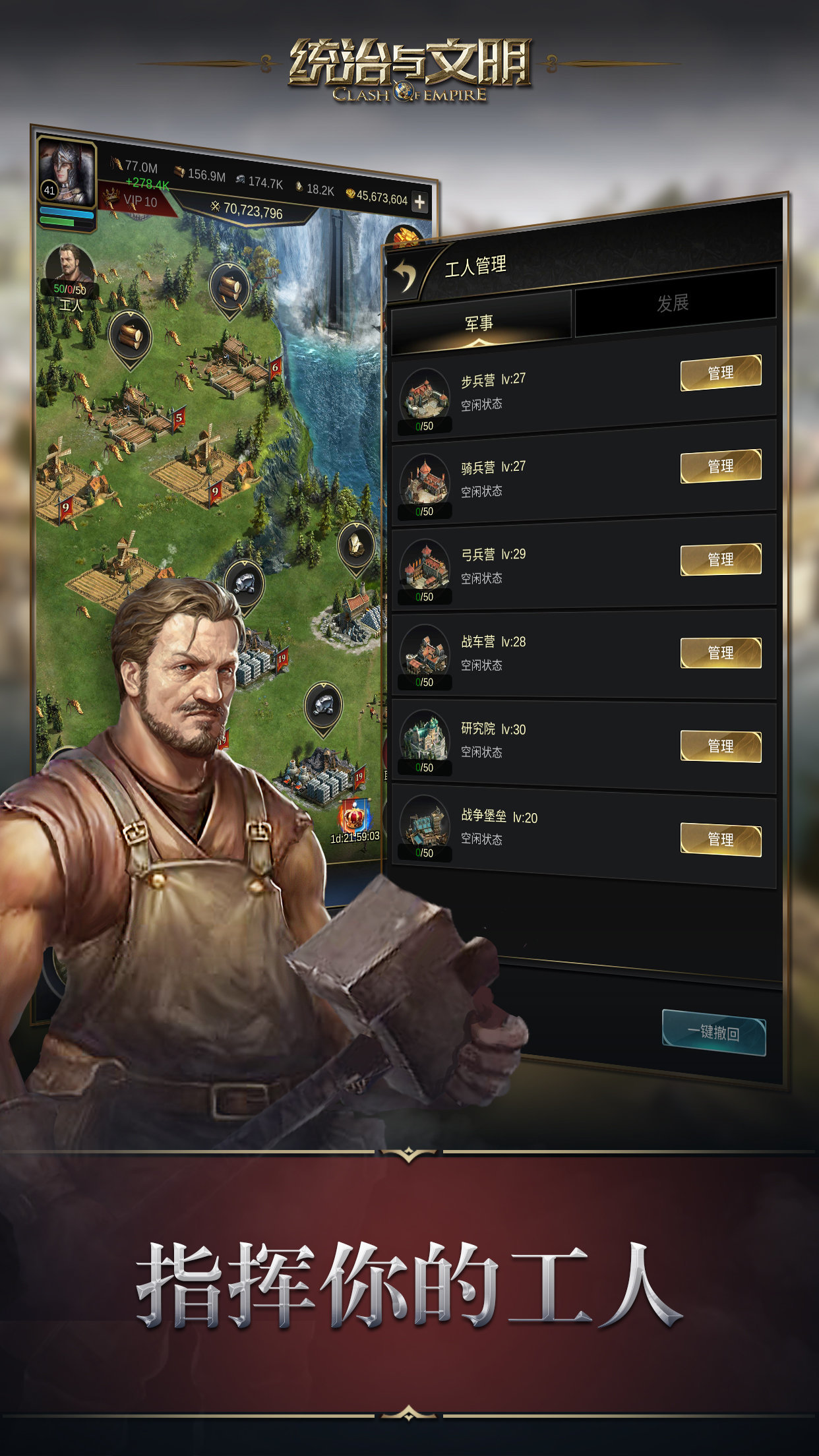3、建设独一无二的奇迹建筑获得不同高额的属性加成,招募不同时代的传奇将领带兵作战!
