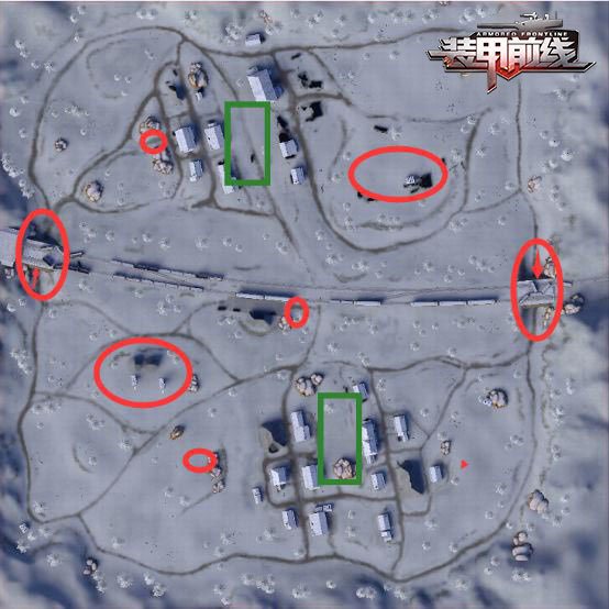 前面已经和大家讲过了,这个模式讲究的就是苟到最后。接下来,我简单给大家讲讲地图上一些可以苟的点位,仅作参考哈。首先是两边的桥洞,我都用箭头给大家标出来了。别完全进到桥洞里,这样方便进也方便退。要是碰到那种你能轻松搞定的车,直接上就完事儿;要是遇到打不过的,赶紧跑才是正理。我用红色标注的地方,都能灵活进退。而我用绿色标注的位置,大家最好别去,因为在那儿四面八方的人都会把你当靶子,去了基本就是九死一生。